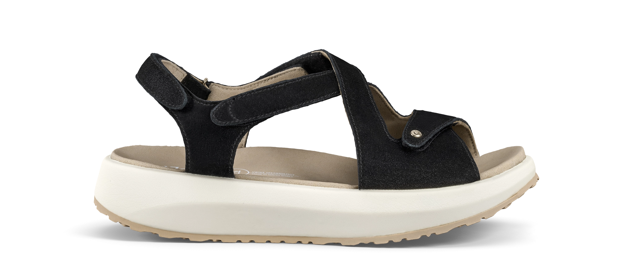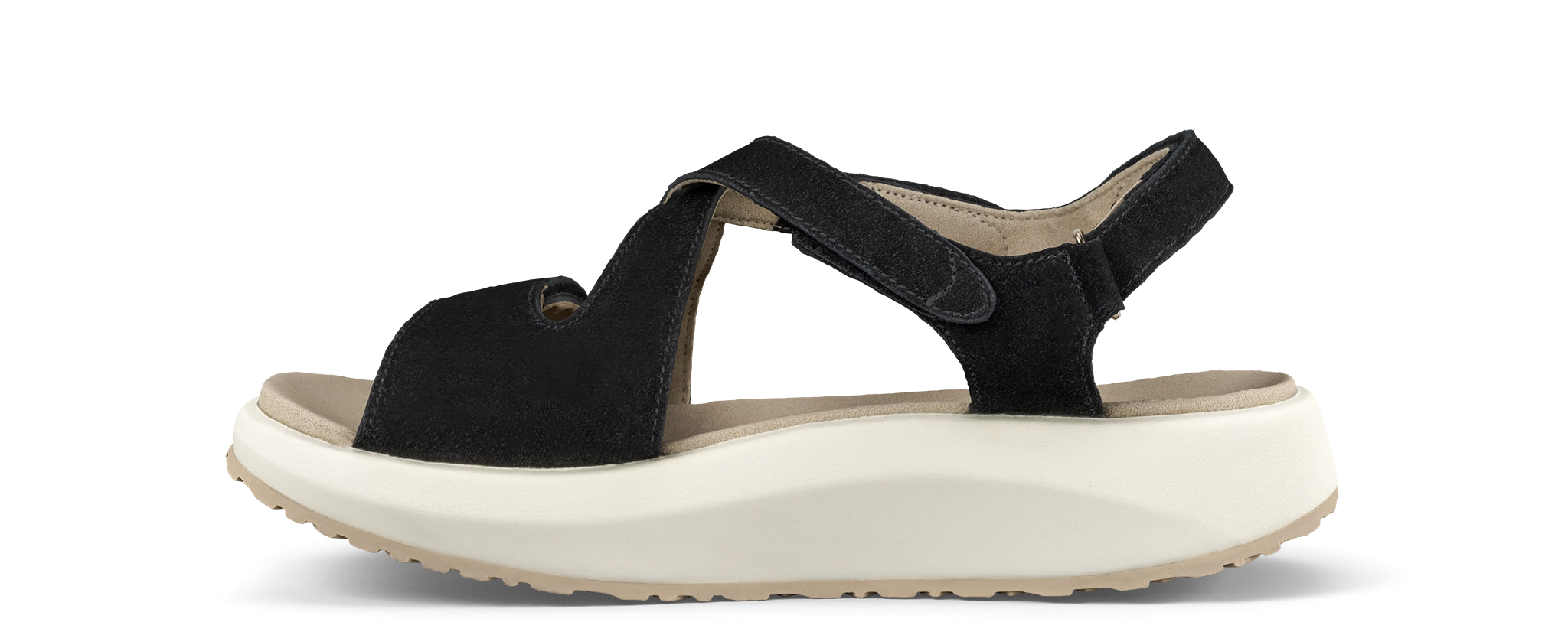 Jenny black: Geschmeidige und exquisite Veloursleder-Sandale mit gekreuzten Riemen, vollständig verstellbar, um sich an jede Fußform anzupassen. Zart und schick, extrem bequem und leicht zu tragen bei jeder Gelegenheit. Ausgestattet mit der Joya Senso Sohlentechnologie, die für eine hervorragende Dämpfung und eine ausgewogene Druckverteilung sorgt und somit optimalen Komfort und Entlastung für Ihre Rückenmuskulatur, Gelenke und Füße bietet.
