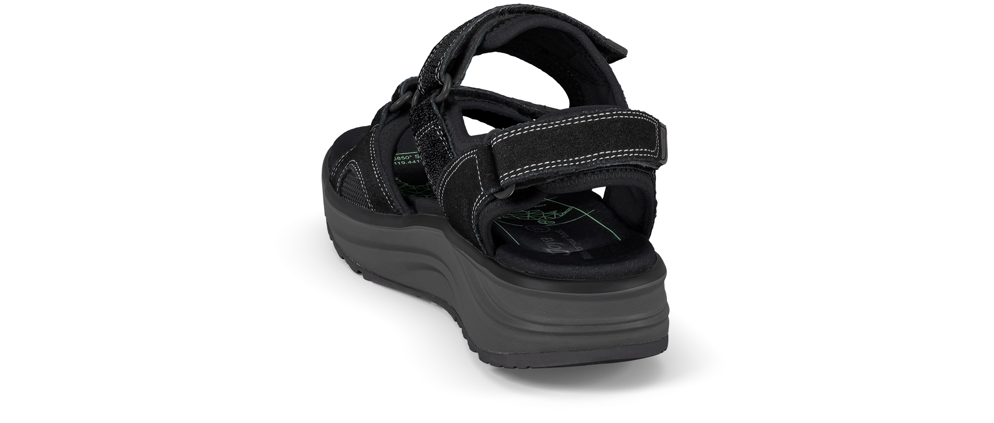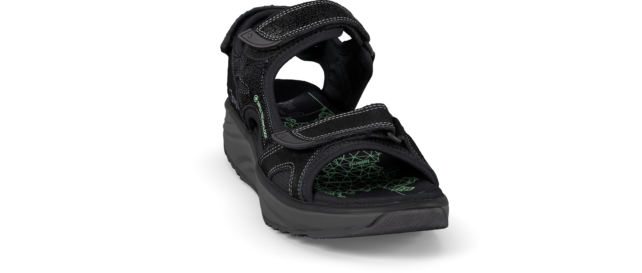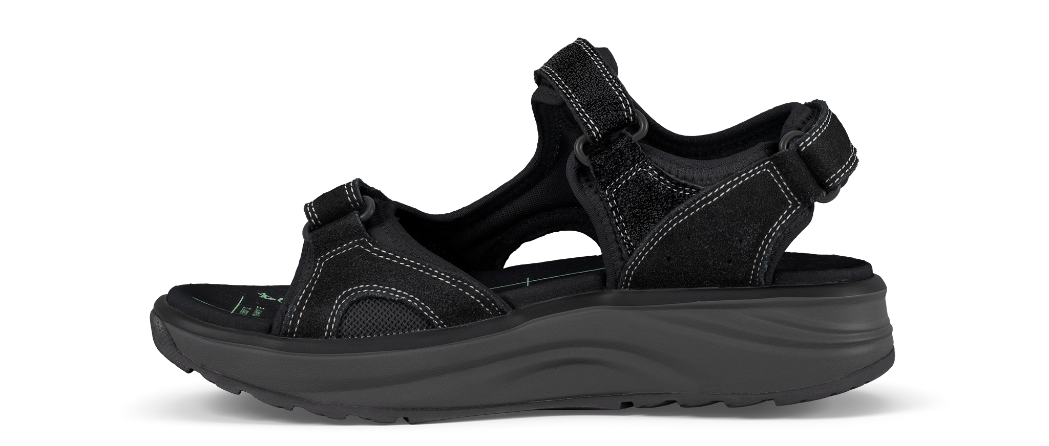 Komodo black: Outdoor-Sandale aus Wildleder und mesh , mit weich gepolstertem Neoprenfutter und verstellbaren Klettverschlüssen an Ferse, Rist und Vorderfuß. Ausgestattet mit einem ergonomischen Fußbett, umhüllt von weicher, samtiger Mikrofaser. Ausgestattet mit der Joya Active Sohlentechnologie, die eine ideale Kombination aus Dämpfung, Rückfederung und Stabilität garantiert. Für dynamische Menschen, die immer in Bewegung sind und Komfort in Aktion und Leistung auf jedem Untergrund brauchen.