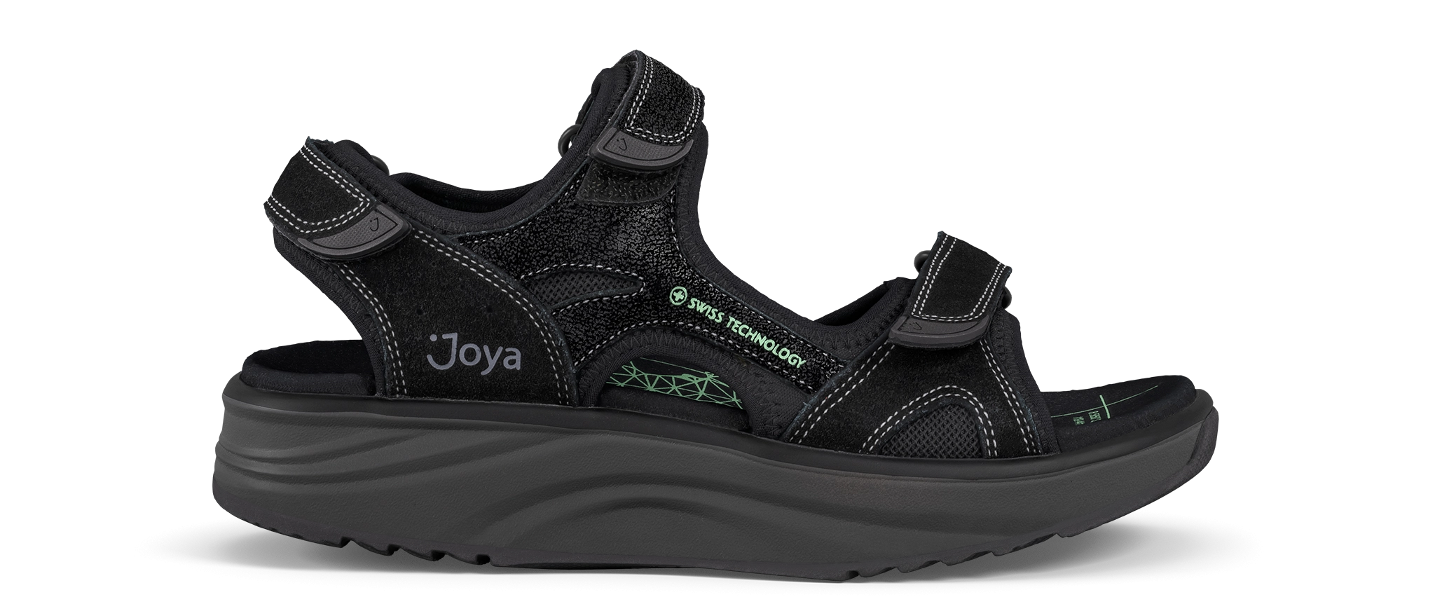 Suede and mesh oudoor sandal, with smoothly padded neoprene lining and adjustable velcro straps on the heel, instep and forefoot. Fitted with an ergonomic footbed wrapped with soft, velvety microfiber. Implemented with the Joya Active sole technology that guarantees an ideal combination of cushioning, rebound and stability. For dynamic people always on the move who need comfort in action and performance on every surface.