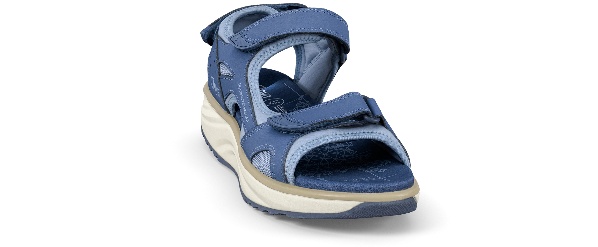 Komodo blue: Outdoor-Sandale aus Leder und mesh , mit weich gepolstertem Neoprenfutter und verstellbaren Klettverschlüssen an Ferse, Rist und Vorderfuß. Ausgestattet mit einem ergonomischen Fußbett, das mit weicher, samtiger Mikrofaser umhüllt ist. Ausgestattet mit der Joya Active Sohlentechnologie, die eine ideale Kombination aus Dämpfung, Rückfederung und Stabilität garantiert. Für dynamische Menschen, die immer in Bewegung sind und Komfort in Aktion und Leistung auf jedem Untergrund brauchen.