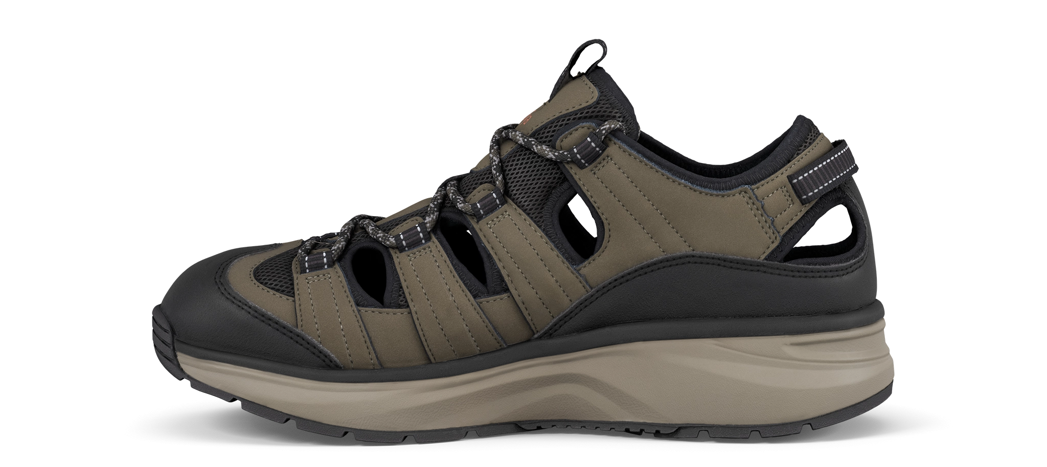 Robuste, geschlossene Zehensandale aus Nubukleder mit weichem und dehnbarem, gepolstertem Nopren-Futter und Schnürsenkeln zum schnellen und einfachen Anpassen. Äußerst bequem und absolut atmungsaktiv dank der offenen Belüftungsöffnungen im Obermaterial. Ausgestattet mit der Joya Active Sohlentechnologie, die eine ideale Kombination aus Dämpfung, Rückfederung und Stabilität garantiert. Für dynamische Menschen, die immer in Bewegung sind, die Komfort in Aktion und Leistung auf jedem Untergrund brauchen.