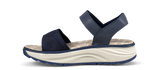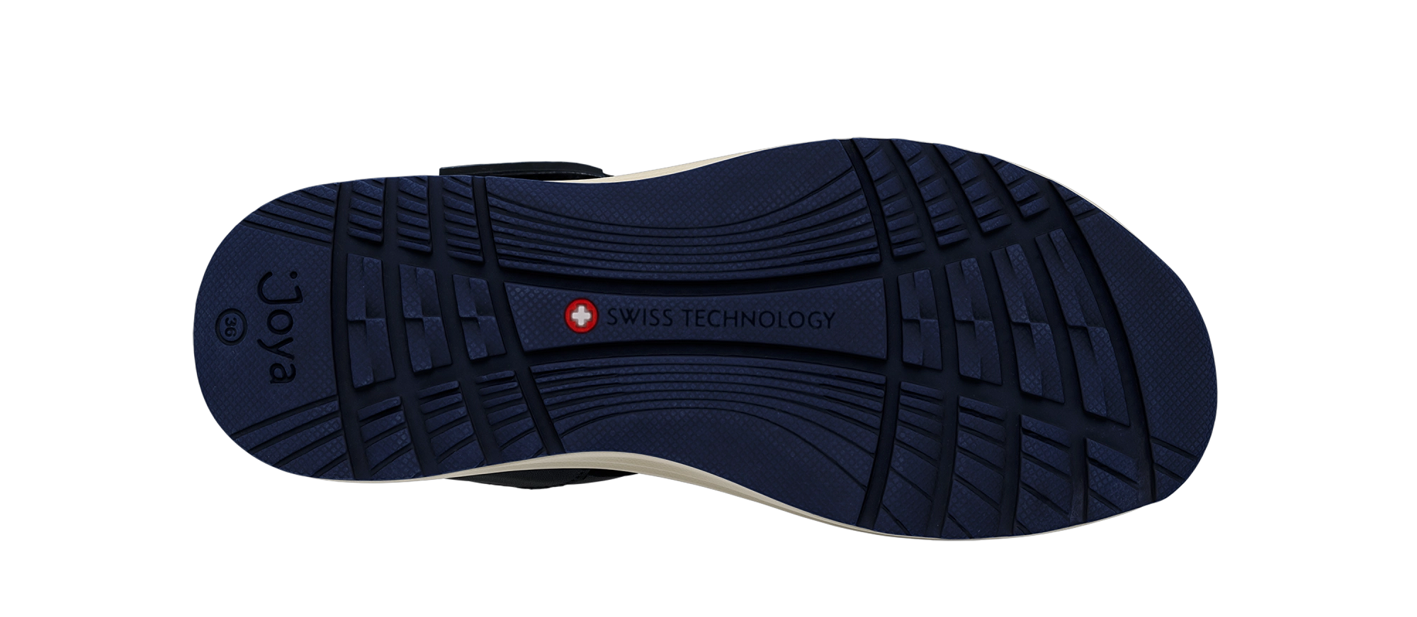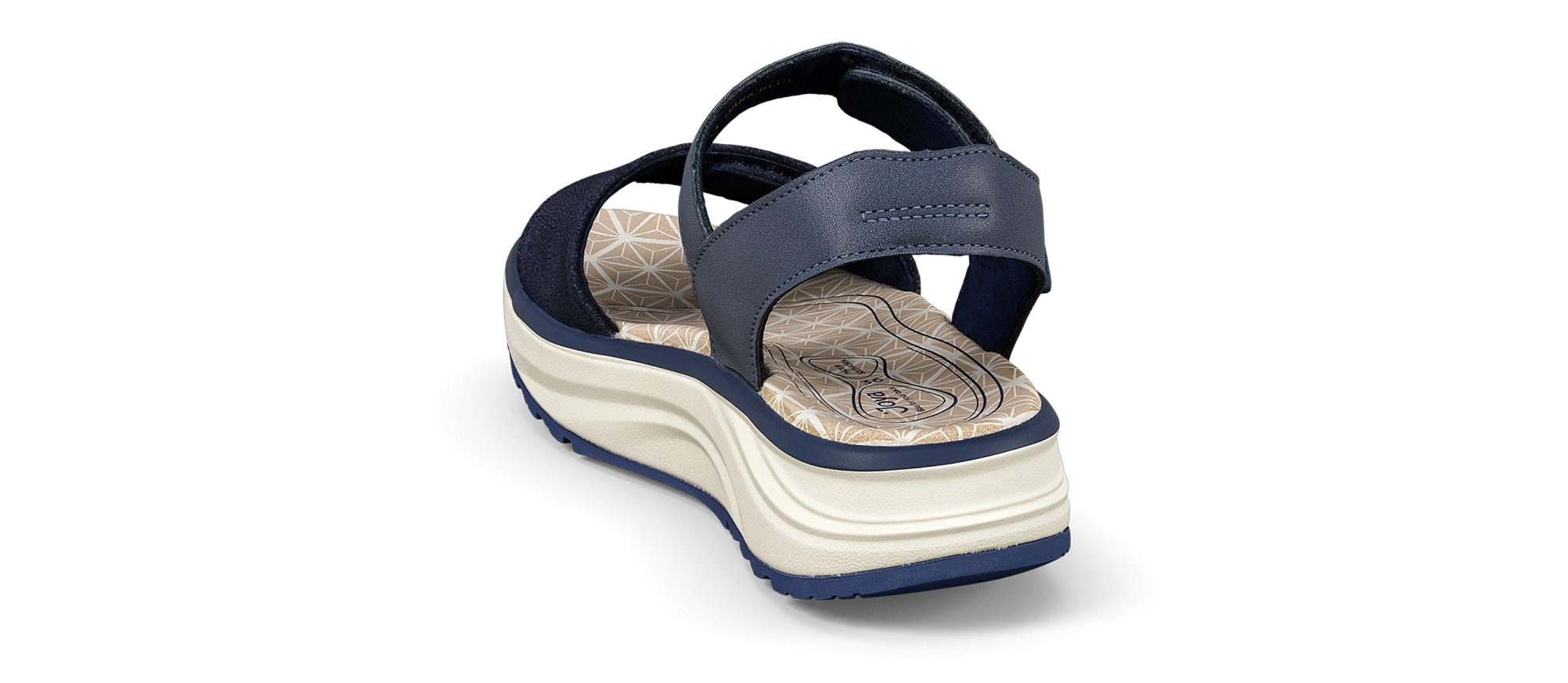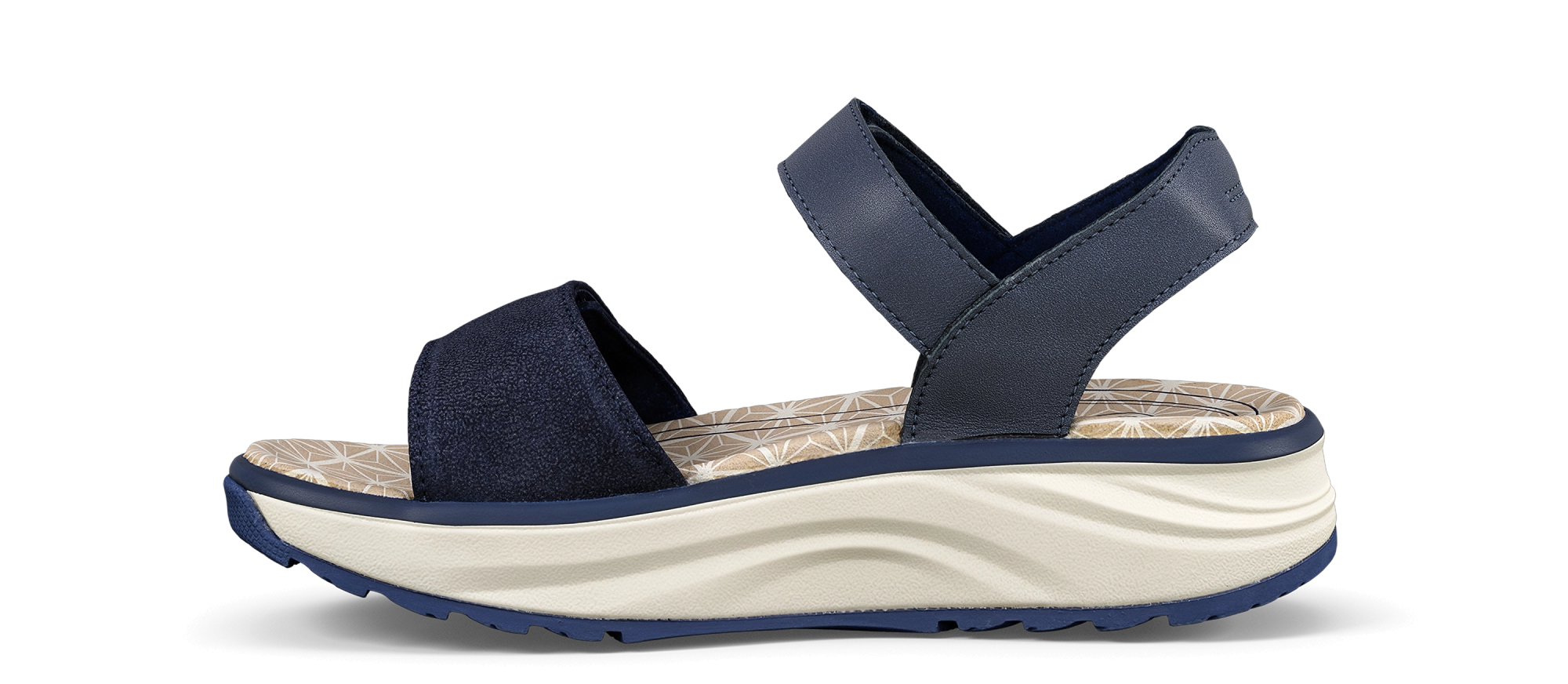 Flores dark blue: Exquisite Sandale aus perlmuttfarbenem Leder und glitzerndem Veloursleder mit verstellbaren Klettverschlüssen am Rist und Vorderfuß. Ausgestattet mit einem ergonomischen Fußbett, umhüllt von weicher, samtiger Mikrofaser. Ausgestattet mit der Joya Active Sohlentechnologie, die eine ideale Kombination aus Dämpfung, Rückfederung und Stabilität garantiert. Für dynamische Menschen, die immer in Bewegung sind und Komfort in Aktion und Leistung auf jedem Untergrund brauchen.