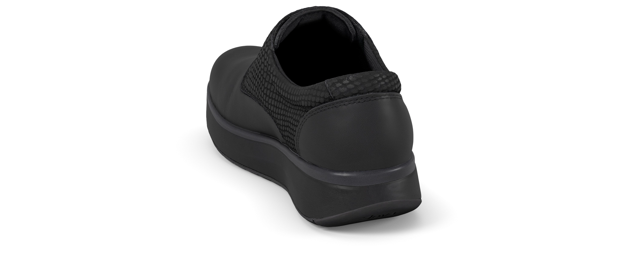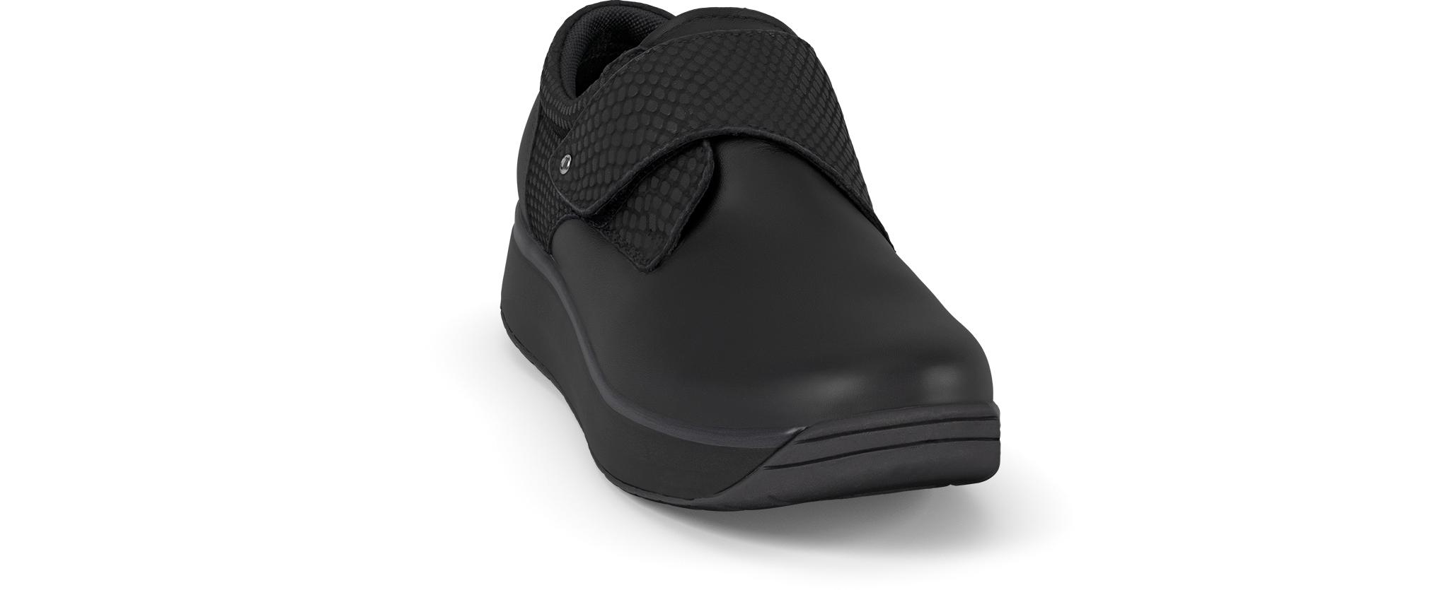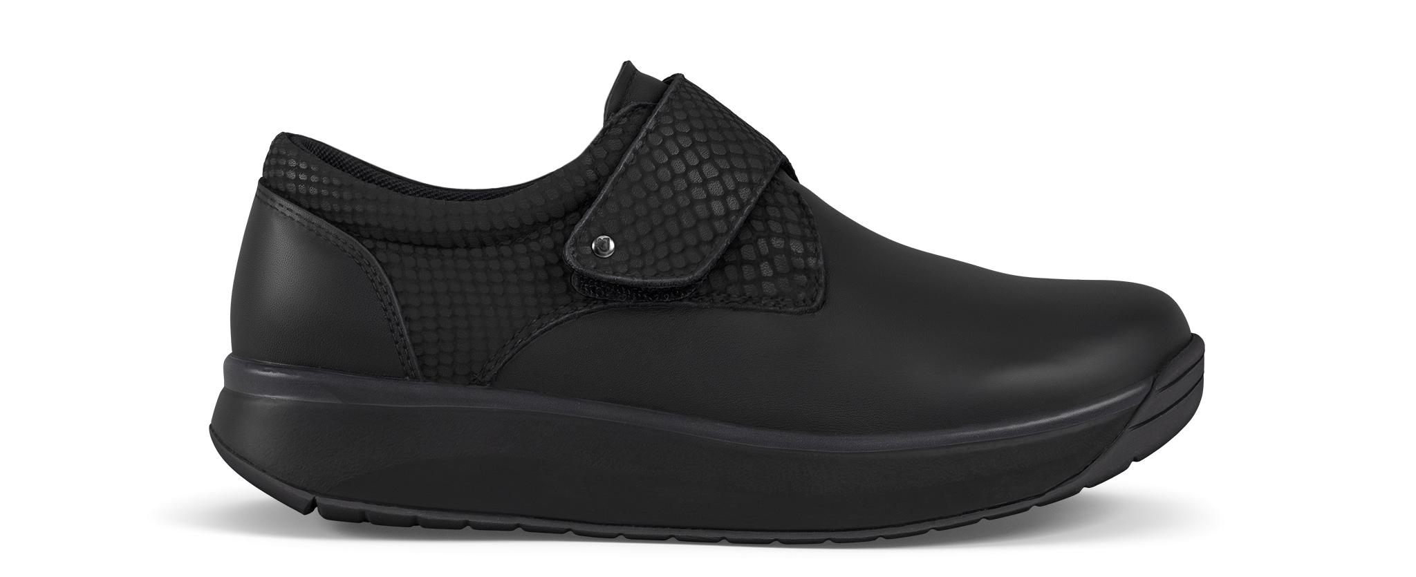 Relax II black: Zapato de piel de tacto suave con sofisticados detalles de serpiente en relieve, cierre de velcro y forro estratificado para evitar puntos de presión en los pies y conseguir una sensación de confort de 360 grados. Incorpora la tecnología de suela Joya Senso , que garantiza un excelente efecto de amortiguación y una distribución equilibrada de la presión, y proporciona una comodidad óptima y un alivio para los músculos de la espalda, las articulaciones y el estrés diario de los pies.
