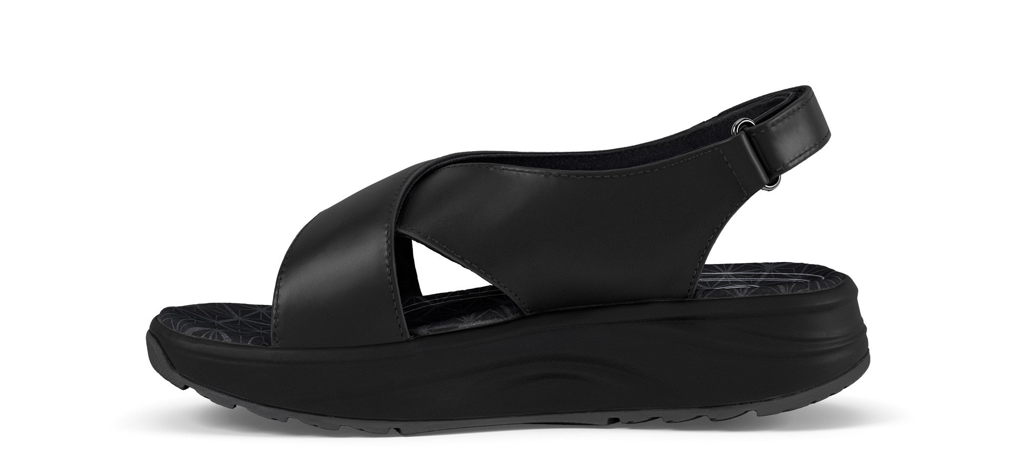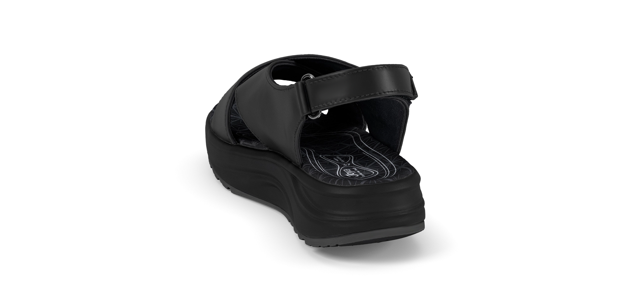 Lisbon black: Elegante y esencial sandalia cruzada de piel plena flor lisa con tira trasera ajustable de velcro. Equipada con una plantilla ergonómica envuelta en suave microfibra aterciopelada. Incorpora la tecnología de suela Joya Active, que garantiza una combinación ideal de amortiguación, rebote y estabilidad. Para gente a la moda, siempre en movimiento, que nunca renuncia a la comodidad.