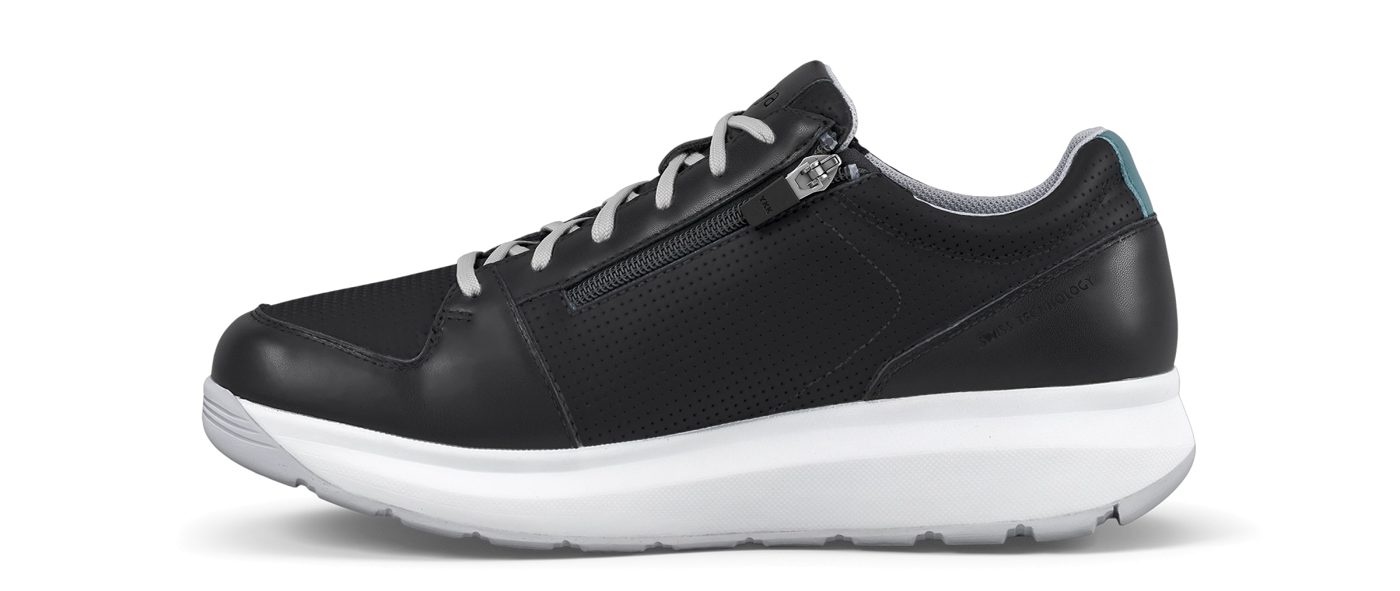 Oliver black: Lightly perforated soft full grain leather lace up shoe with additional zipper for easy entry, with breathable mesh lining. Smart and casual, easy to wear in every occasion. Featured with the Joya Senso sole technology that ensures excellent cushioning effect and balanced pressure distribution, and delivers optimum comfort and relief for your back muscles, joints and feet daily stress.