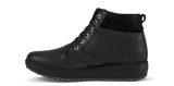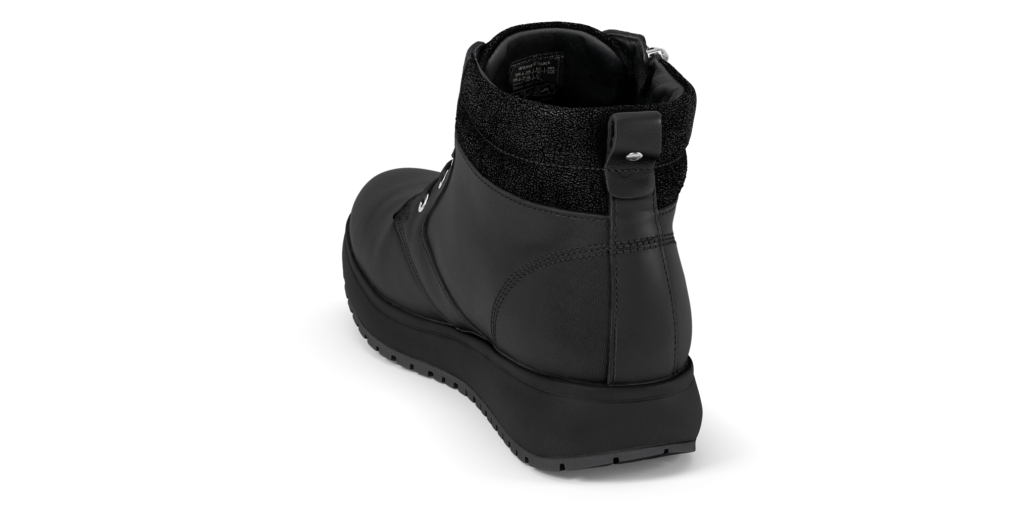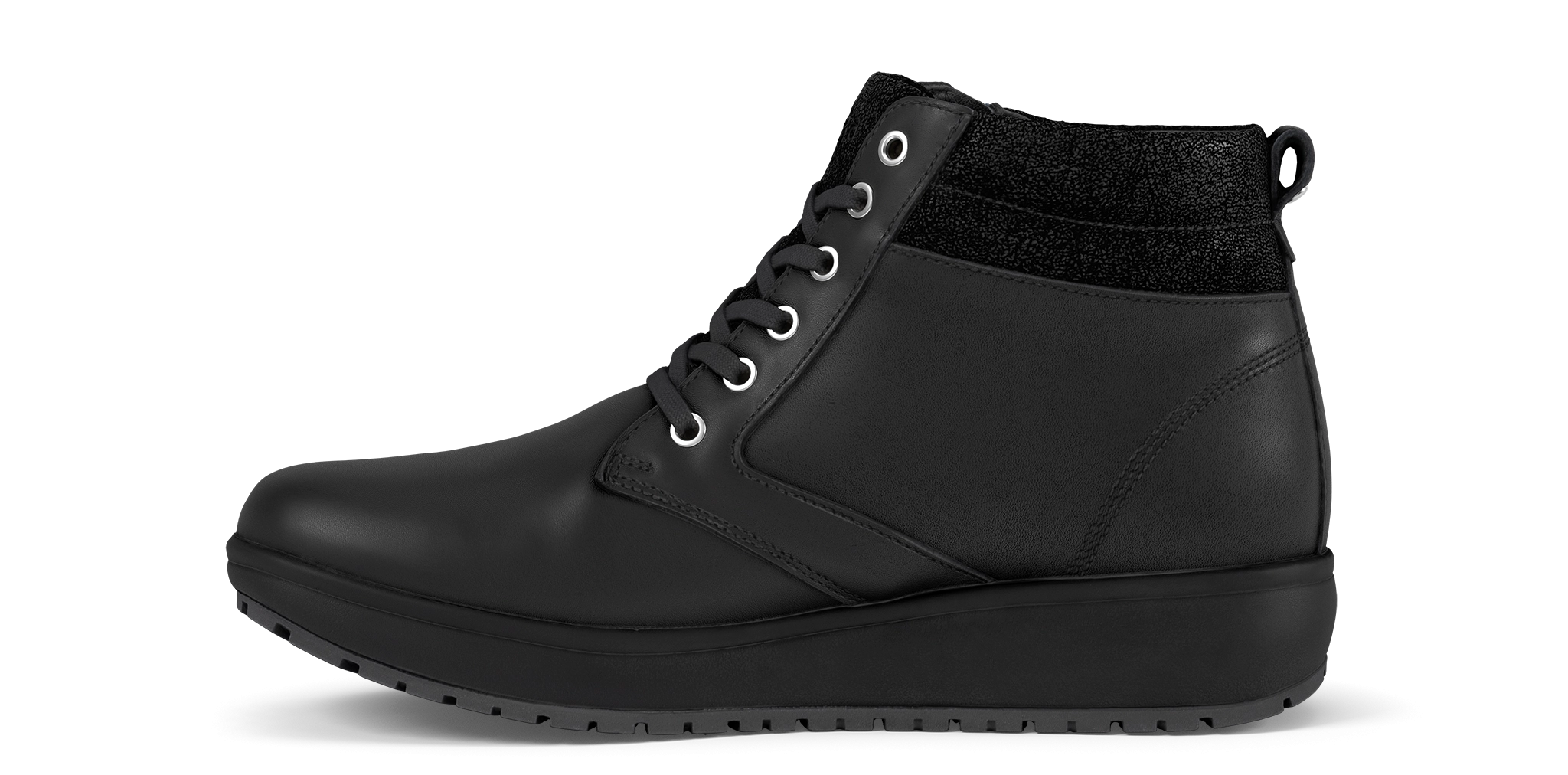 Wilma II black: Botte élégante à lacets avec fermeture éclair pour une entrée facile. Tige en cuir pleine fleur souple avec col rembourré en daim mousseux. Doublure en cuir et textile. Améliorée par la technologie de la semelle Joya Senso avec un effet amortissant unique, qui soulage de manière optimale les muscles du dos et les articulations.