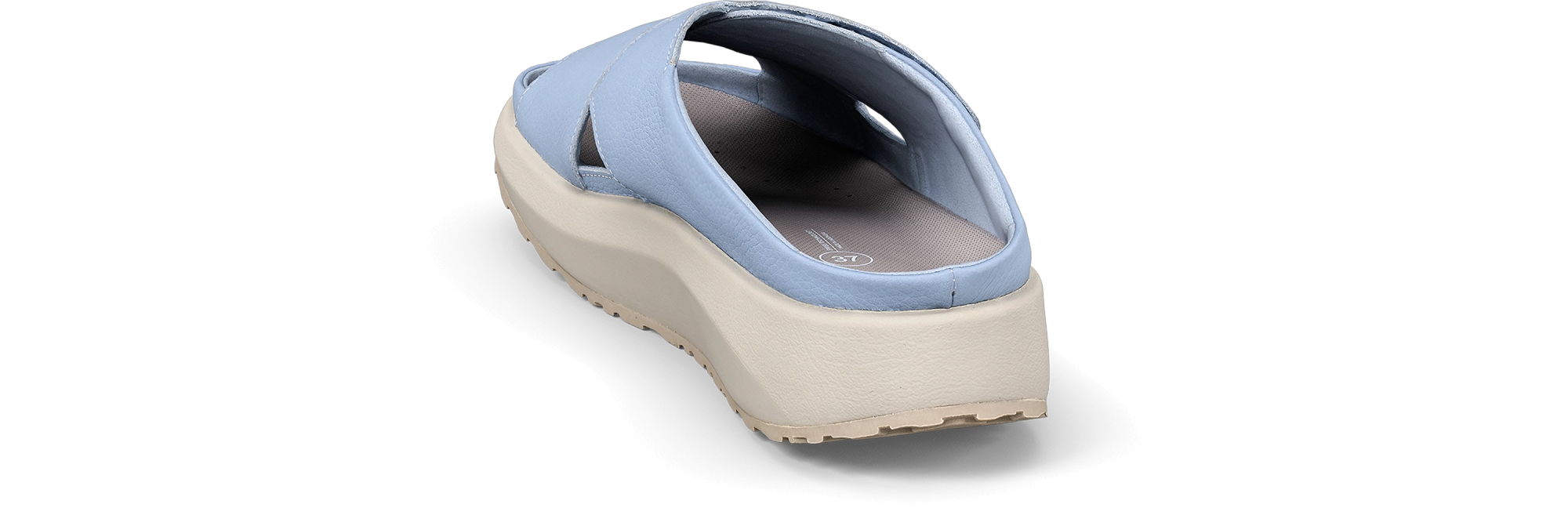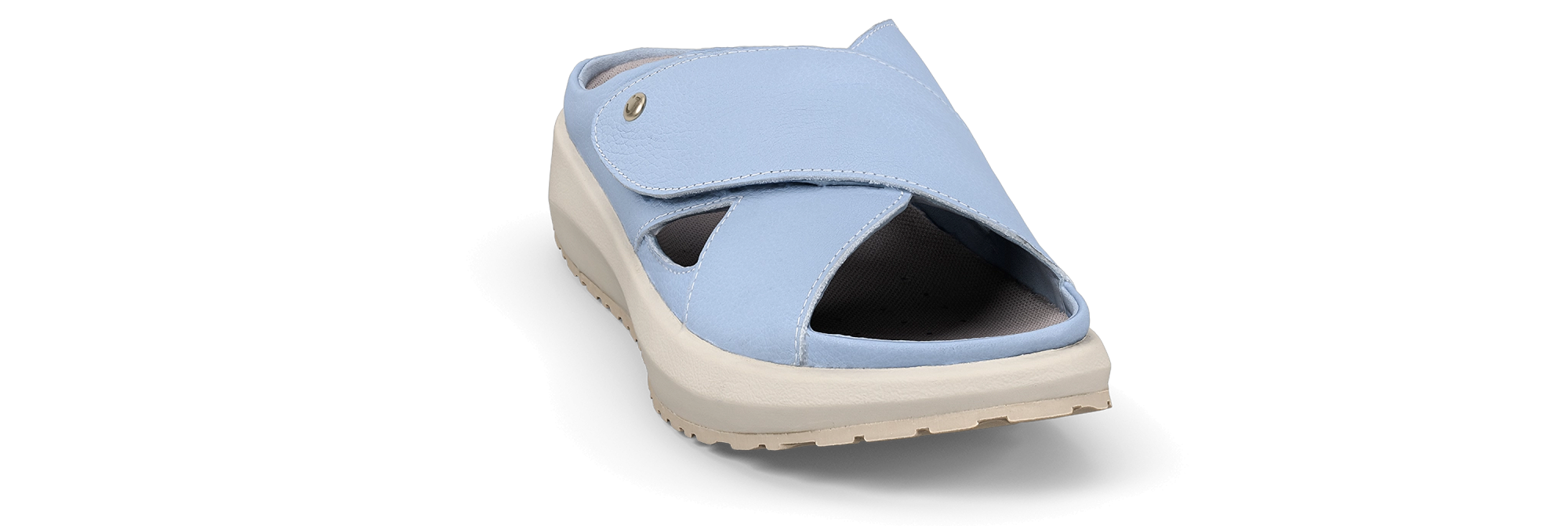 Alicante light blue: Sandalo slide in pelle bottalata, morbido e sottile, con ampio cinturino regolabile in velcro e soletta estraibile sagomata. Adatto sia per uso interno che outdoor grazie alla suola in gomma resistente all'abrasione. Dotato della tecnologia della suola Joya Senso che garantisce un eccellente effetto ammortizzante e una distribuzione equilibrata della pressione, offrendo un comfort ottimale e un sollievo per i muscoli della schiena, le articolazioni e lo stress quotidiano dei piedi.