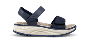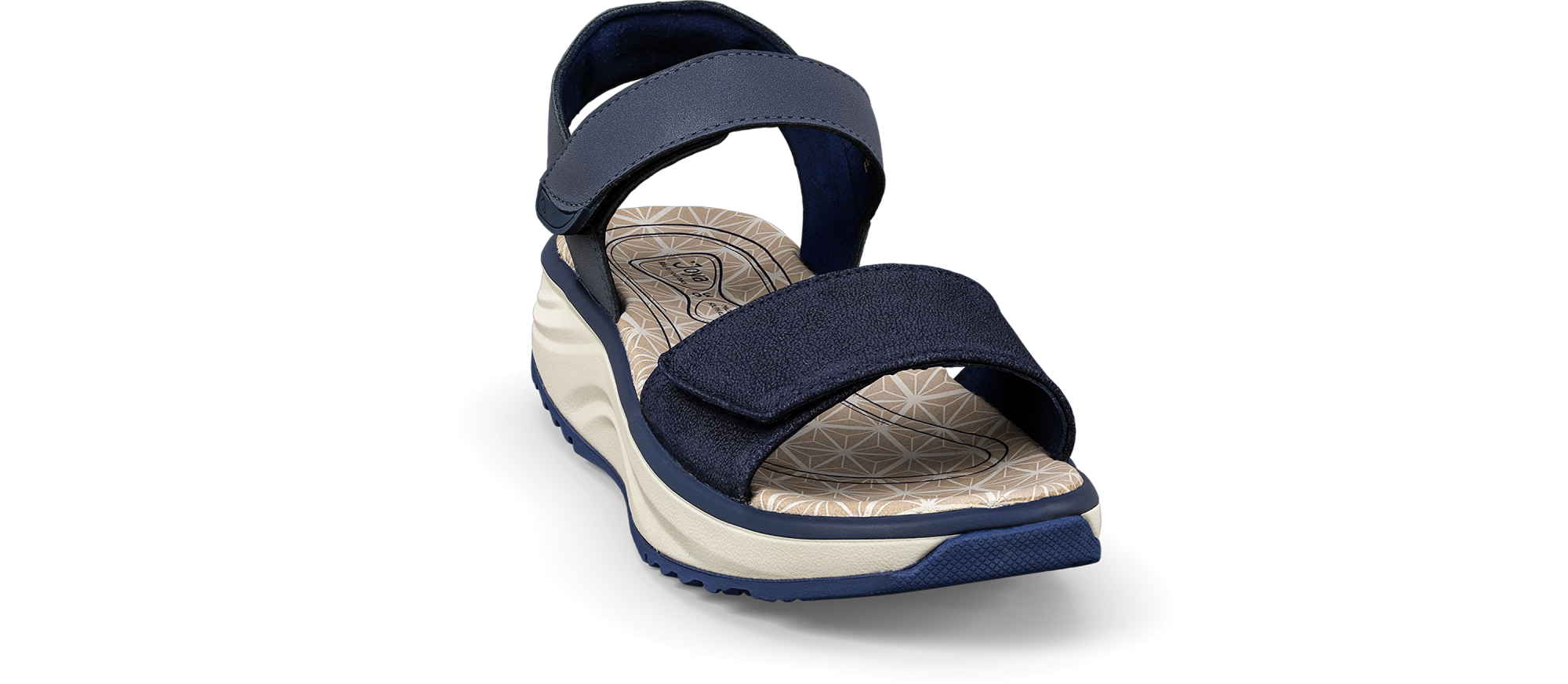 Flores dark blue: Squisito sandalo in pelle perlata e pelle vellutata scintillante con cinghie di velcro regolabili sul collo del piede e sull'avampiede. Dotato di un plantare ergonomico avvolto in morbida microfibra vellutata. Implementato con la tecnologia della suola Joya Active che garantisce una combinazione ideale di ammortizzazione, rimbalzo e stabilità. Per persone dinamiche sempre in movimento che hanno bisogno di comfort in azione e performance su ogni superficie.