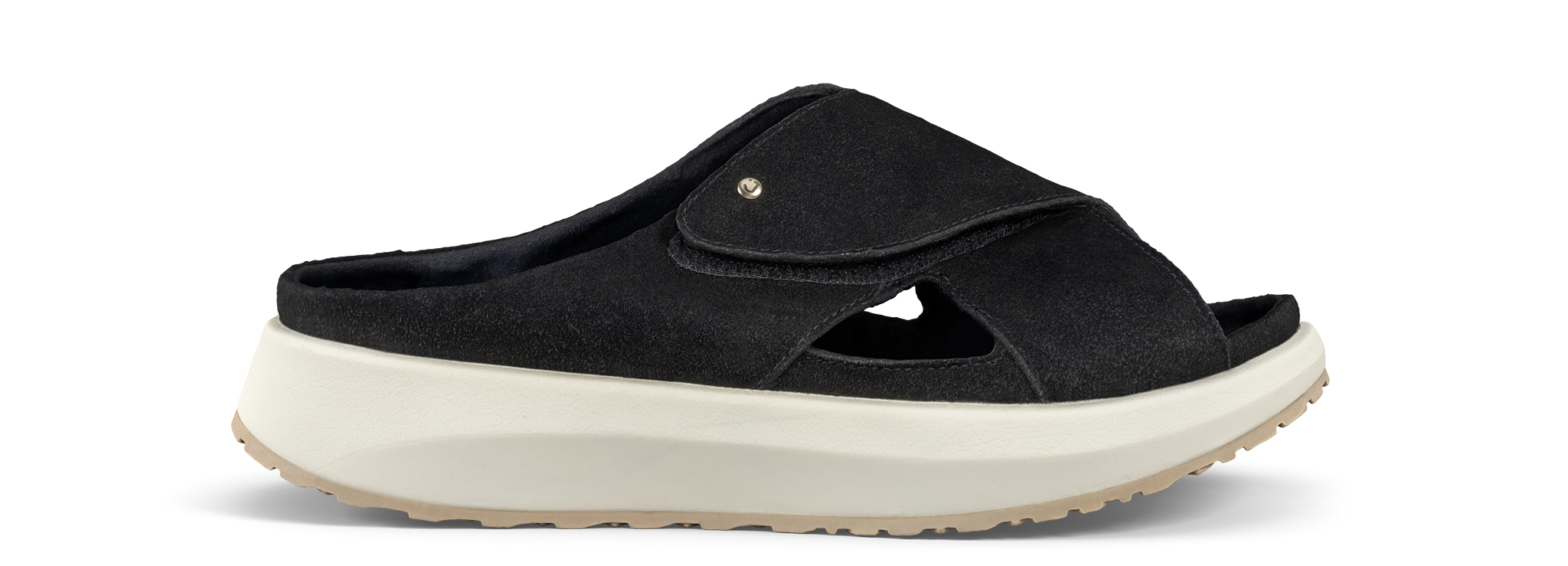 Alicante black: Zachte en pluizige veloursleren slippersandaal met brede verstelbare klittenbandsluiting en voorgevormde uitneembare binnenzool. Geschikt voor zowel binnen als op outdoor dankzij de slijtvaste rubberen zool. Voorzien van de Joya Senso zooltechnologie die zorgt voor een uitstekend dempingseffect en evenwichtige drukverdeling, voor optimaal comfort en verlichting van je rugspieren, gewrichten en voeten bij dagelijkse belasting.