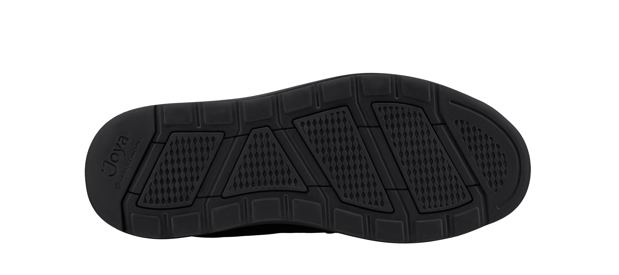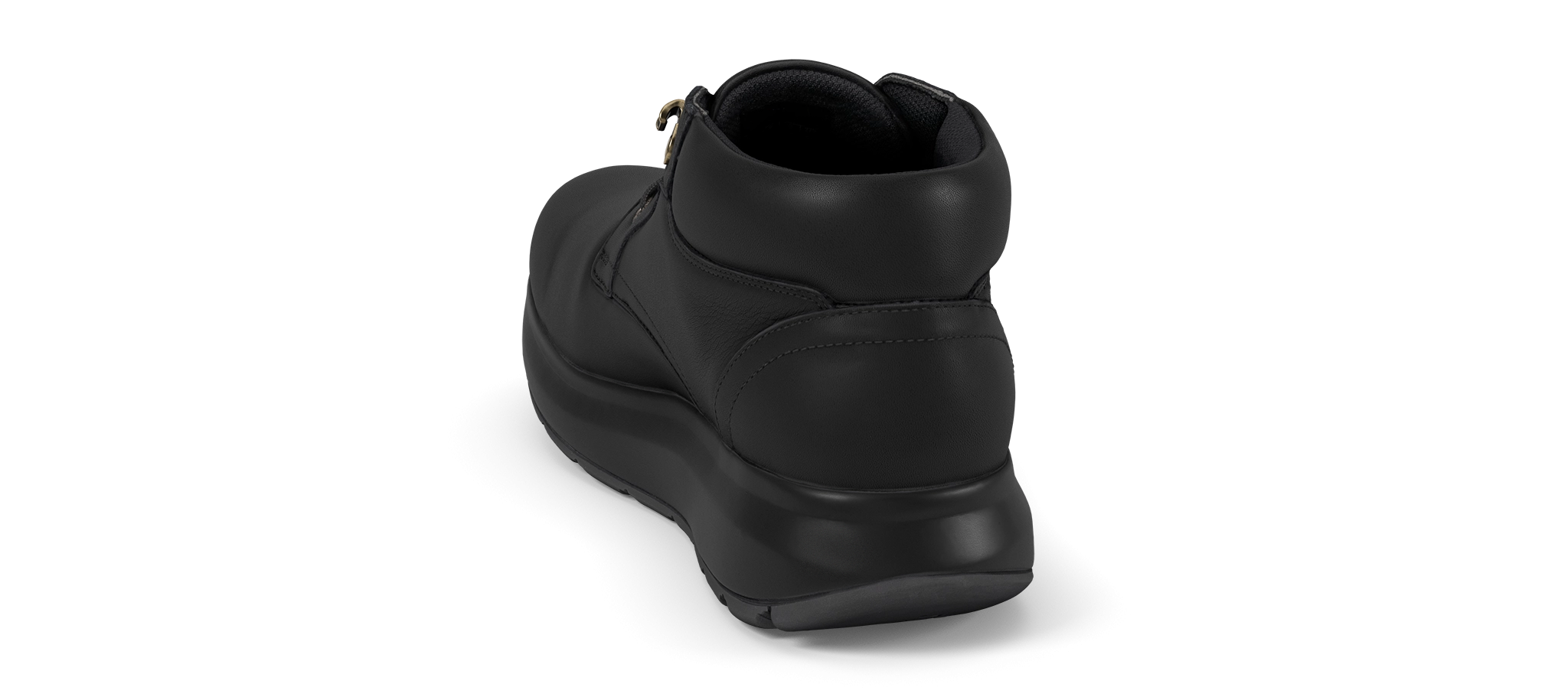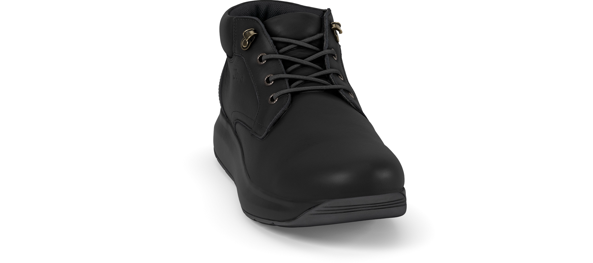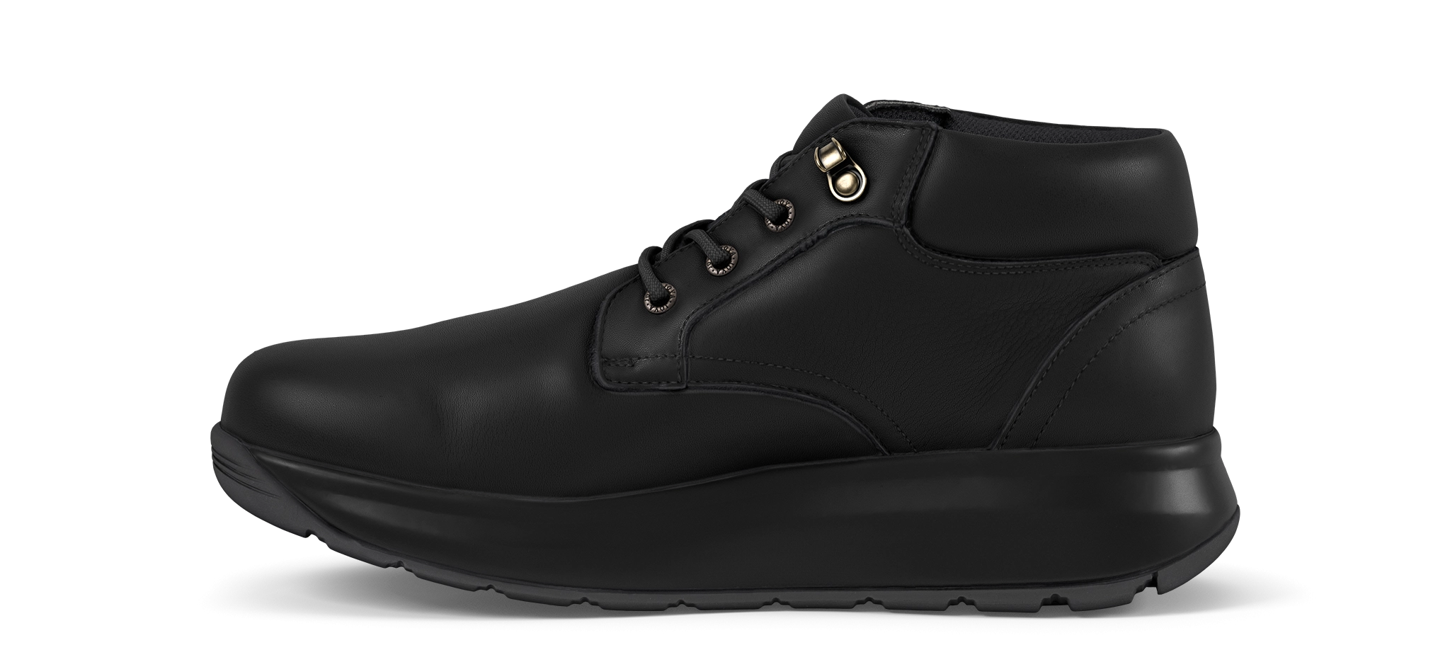 Osaka black: Full grain tumbled leather lace up chukka boot with metal eyelets and top hook. With plain, seamless toe and padded ankle collar for superlative comfort. Featured with the Joya Senso sole technology that ensures excellent cushioning effect and balanced pressure distribution and delivers optimum comfort and relief for your back, joints and feet daily stress.