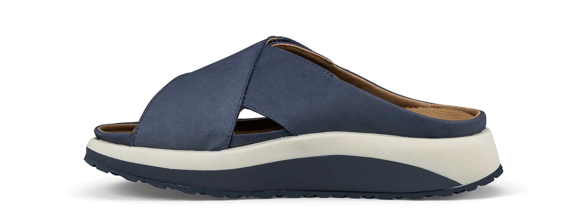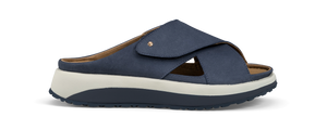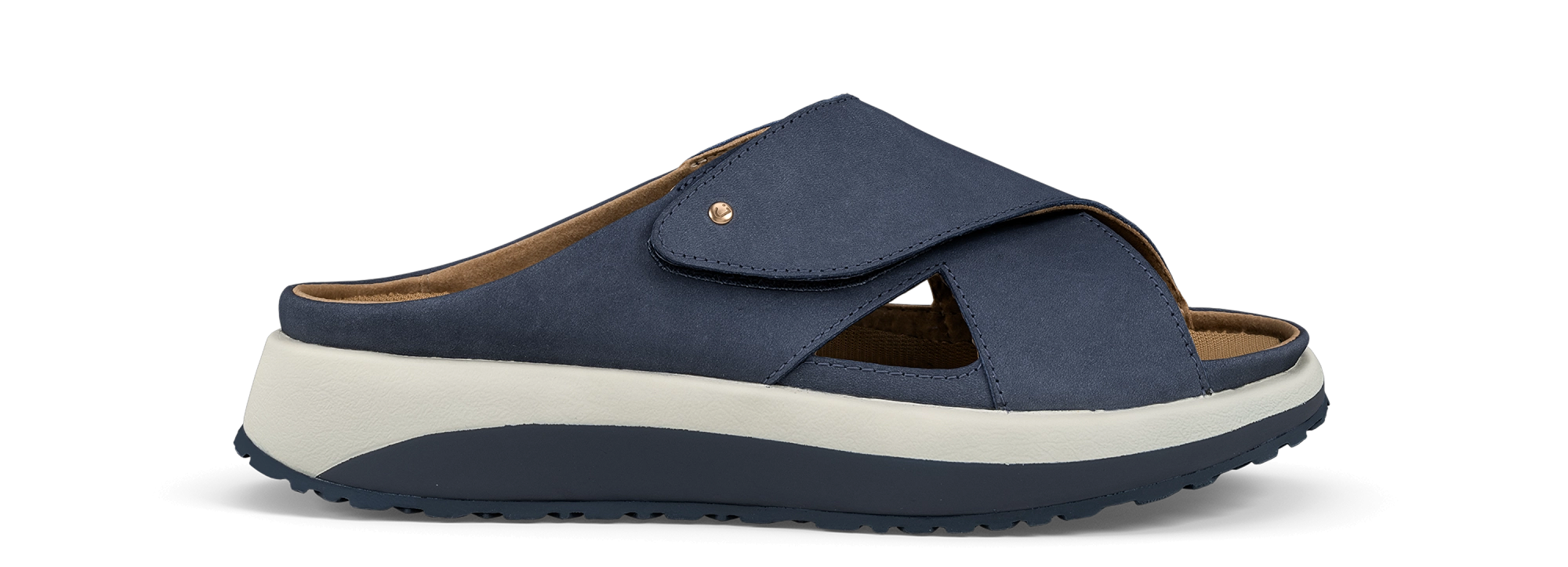 Alicante blue is a versatile yet stylish slip-on sandal made from soft nubuck leather. The wide hook-and-loop strap allows for easy, precise adjustment, while the shaped, removable insole ensures a comfortable feel. Thanks to the abrasion-resistant rubber outsole, the sandal is suitable for both indoor and outdoor wear. Joya Senso sole technology provides step-by-step cushioning, even pressure distribution and noticeable relief for your back, joints and feet.