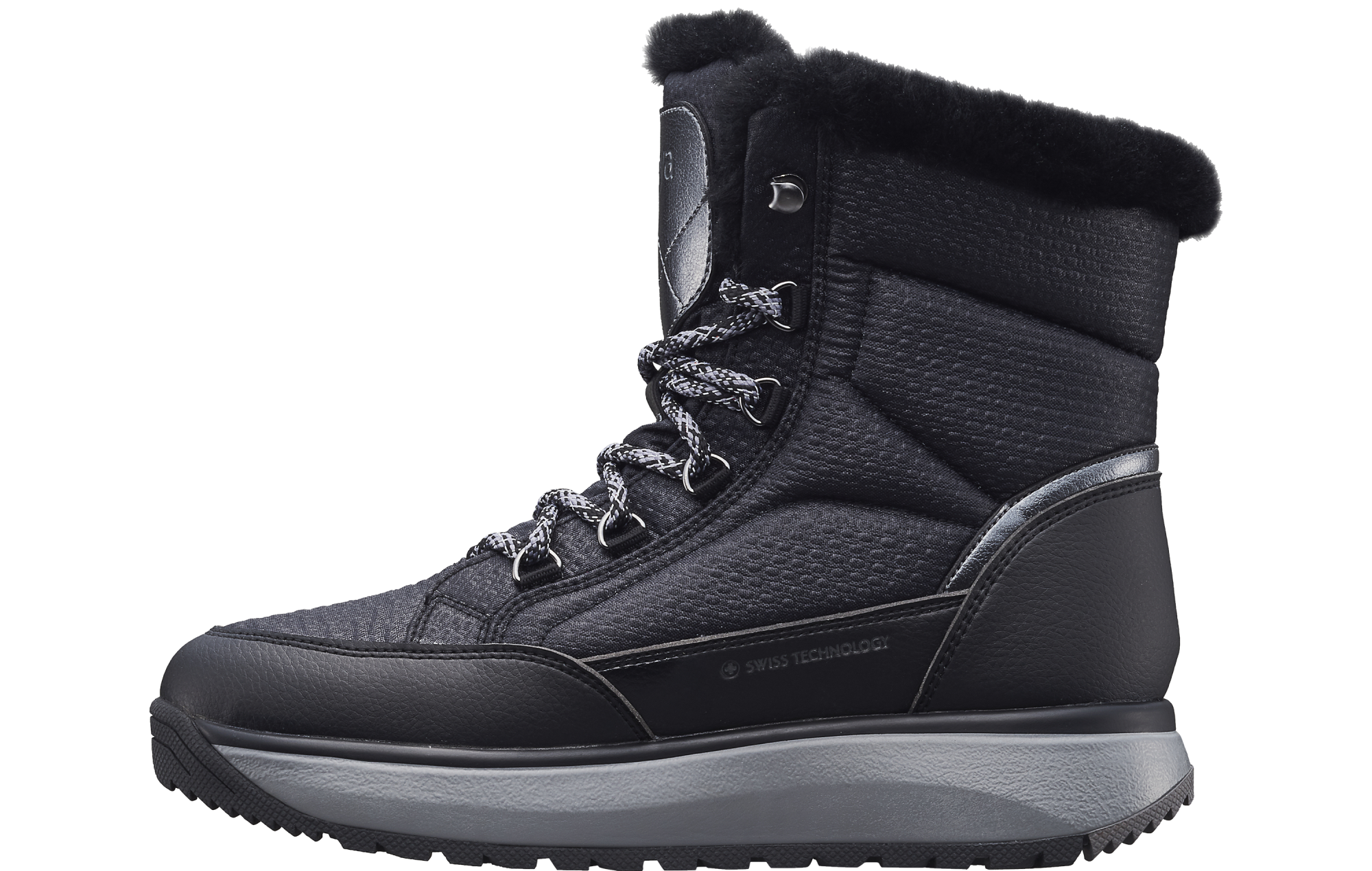 Tiffany STX black: Ripstop nylon boots with speed lacing system and synthetic fur lining. Fitted with breathable Sympatex membrane water resistant construction to keep your feet warm and dry and treaded rubber outsole for extra traction. Featured with the Joya Senso sole technology that ensures excellent cushioning effect and balanced pressure distribution and delivers optimum comfort and relief for your back muscles, joints and feet daily stress.