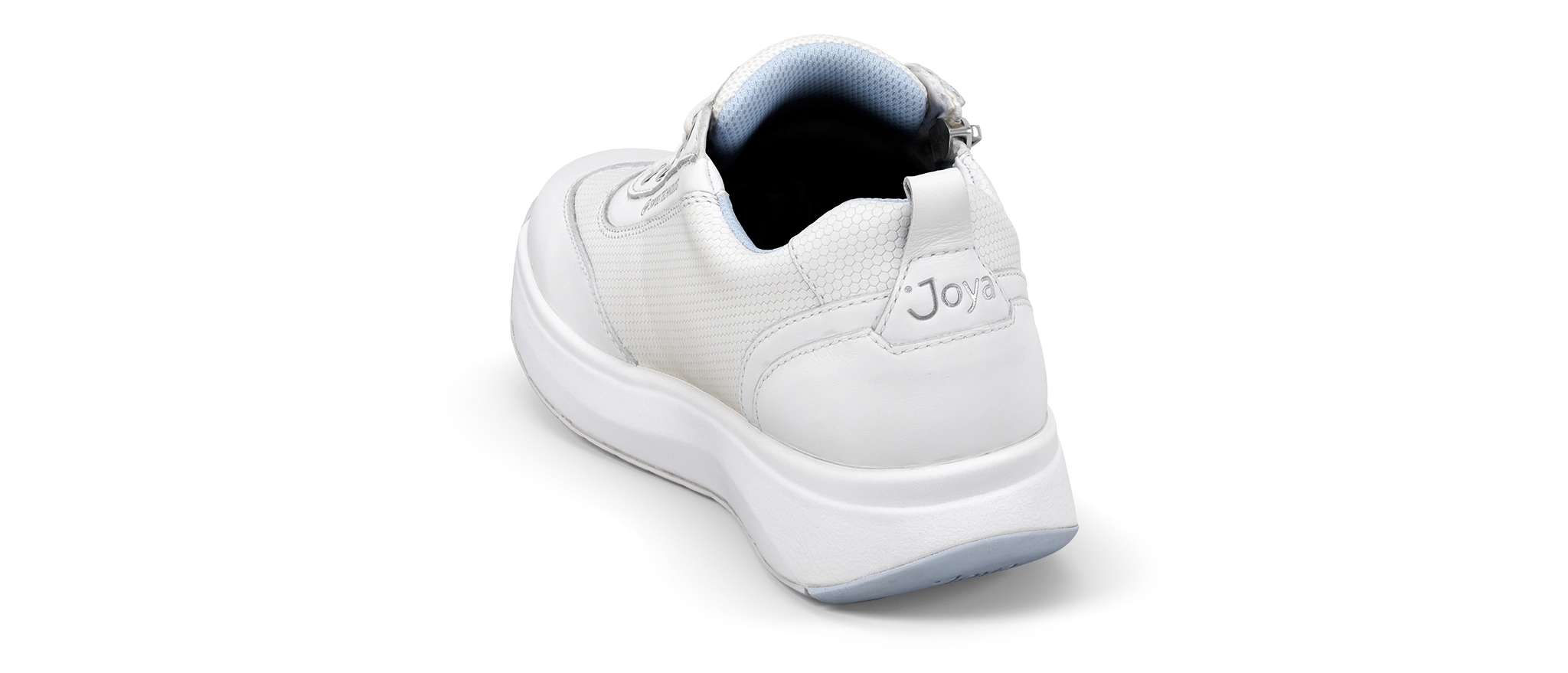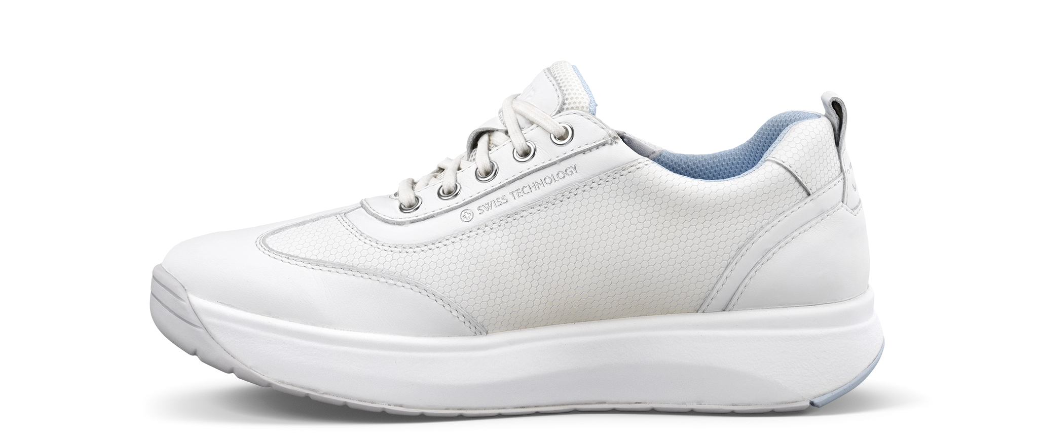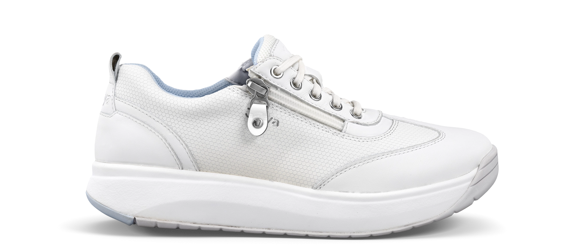 Laura white: High-quality leather lace-up shoe with finely embossed side panels, a practical side zipper for easy on and off, and breathable mesh lining. Your stylish and comfortable everyday companion. Joya Senso sole technology provides excellent cushioning and even pressure distribution – delivering noticeable relief for your back, joints, and feet.