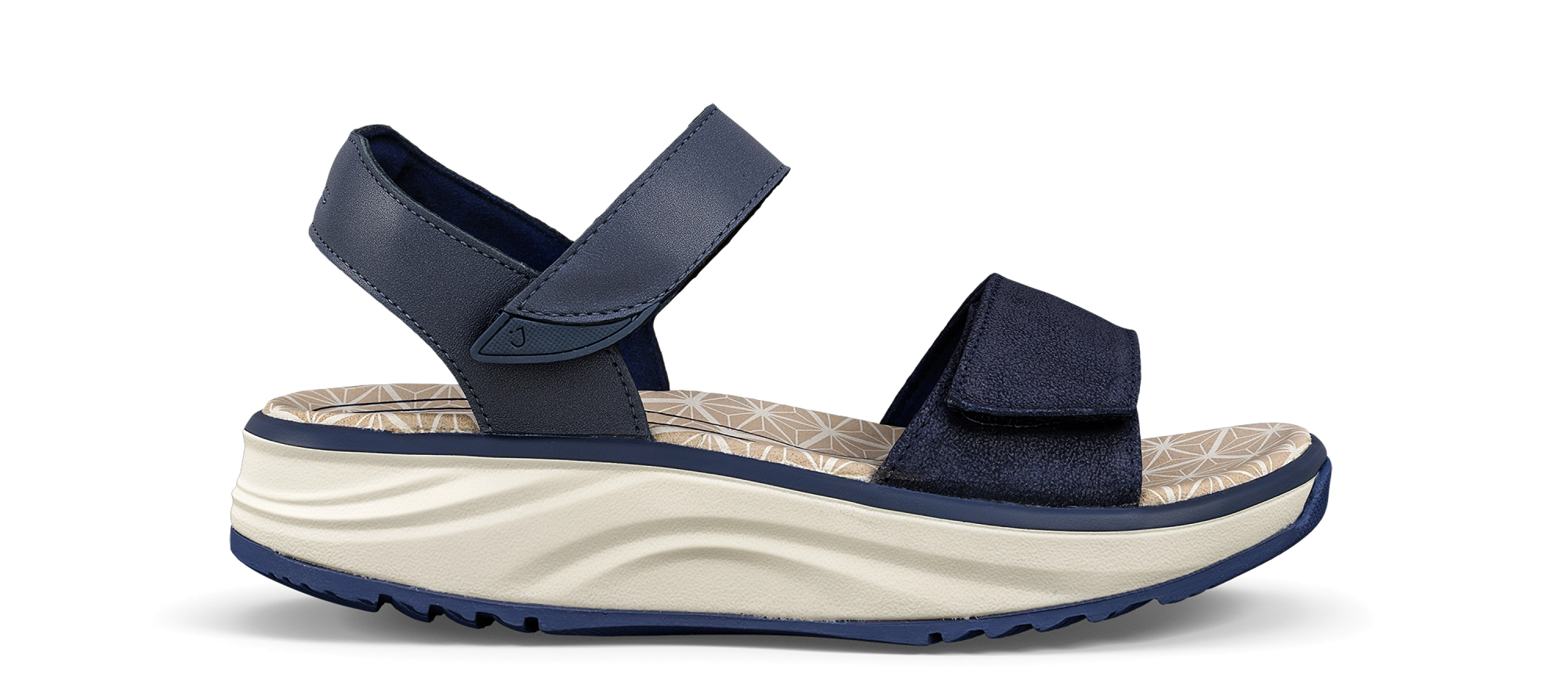 Flores dark blue: Exquisite pearlized leather and sparkling velour leather sandal with adjustable velcro straps on the instep and forefoot. Fitted with an ergonomic footbed wrapped with soft, velvety microfiber. Implemented with the Joya Active sole technology that guarantees an ideal combination of cushioning, rebound and stability. For dynamic people always on the move who need comfort in action and performance on every surface.